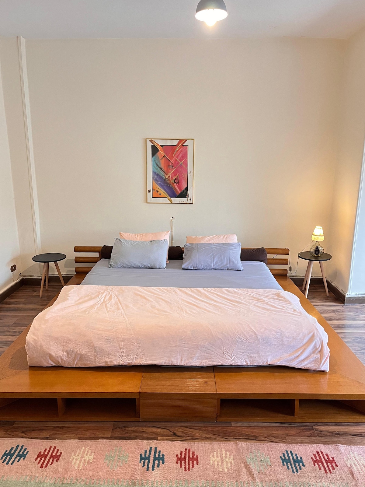 Disfruta del encanto de nuestro loft iluminado por el sol. Un encantador oasis situado en el bullicioso corazón de la isla de Zamalek. Adornada con un toque chic, esta acogedora morada ofrece una elegante sala de estar equipada con un televisor inteligente curvo de 65 pulgadas. Relájate en dos acogedores dormitorios adornados con colchones de espuma viscoelástica y lujosas sábanas de algodón egipcio, lo que garantiza una estancia tranquila. Con un baño completo para mayor comodidad, relájate cómodamente y disfruta de las encantadoras vistas de Zamalek desde la magnífica terraza.