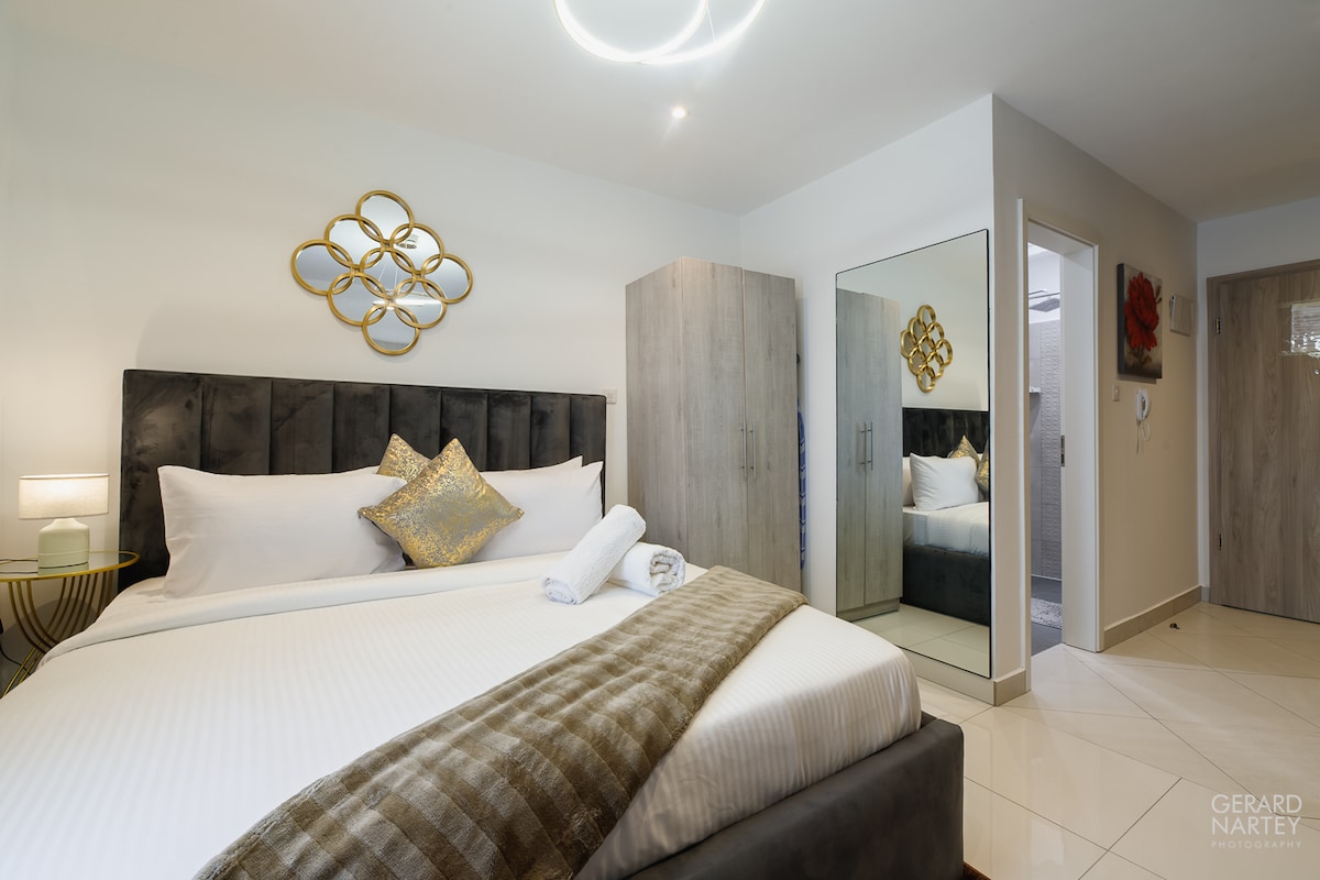 Disfruta de esta nueva suite ejecutiva céntrica con vistas al aeropuerto. Esta suite recién amueblada en el séptimo piso ofrece impresionantes vistas a la ciudad desde un balcón privado. Los huéspedes tienen acceso a piscinas en la azotea, gimnasio de última generación en el piso 11 con vistas panorámicas, jardines tranquilos en la planta baja y en la azotea, un restaurante y un supermercado abierto las 24 horas. Disfruta de seguridad profesional las 24 horas, acceso biométrico y aparcamiento subterráneo seguro. Ubicado a solo 7 minutos del aeropuerto y a 6 minutos del centro comercial principal de Accra.