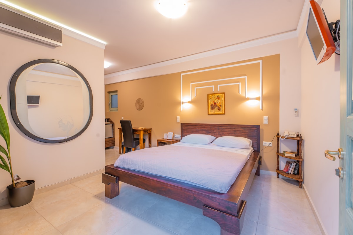 Una habitación luminosa y cómoda con un diseño limpio y moderno y tonos neutros suaves, que ofrece una estancia acogedora en el corazón de Atenas. Disfruta de una cómoda cama doble, suelos de madera, un moderno baño con ducha, aire acondicionado, conexión wifi gratuita y una nevera para tus artículos esenciales. Los grandes ventanales enmarcan las vistas a la ciudad y llenan la habitación de luz natural. Comienza el día con un café de cortesía en el vestíbulo y termínalo en la azotea con vistas panorámicas y un relajante jacuzzi.