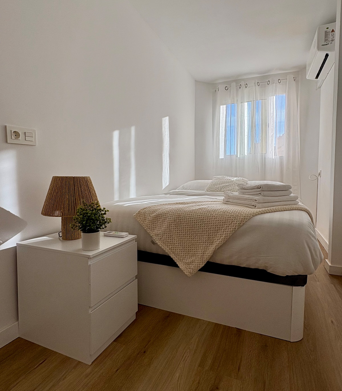 Apartamento estiloso con bonita terraza y vistas al mar. En un residencial con piscina y zonas comunes muy bonitas y cuidadas, y sobre todo tranquilo. Muy luminoso, terraza espectacular, dormitorio amplio con cama 1.5x2m (colchones nuevos), cocina con pasador, AA, Internet rápido, TV 50" (YouTube, Prime..). Cerca de todo tipo de servicios: Playa a 500m, supermercados, farmacia y restaurantes a menos de 5min a pie. Puerto deportivo a 10min, por paseo marítimo. Palacio congresos a 15min andando.