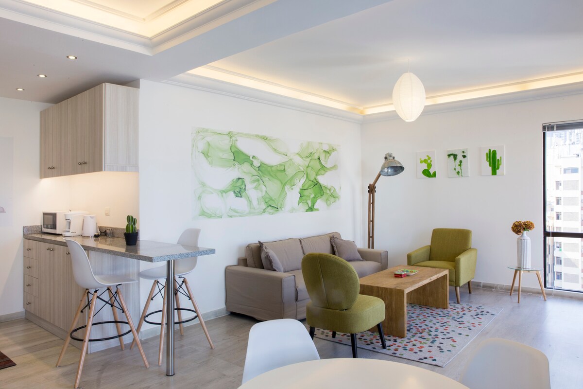 Situado en un barrio vibrante en Mar Mikhael con bares de moda, boutiques y galerías de arte, todo dentro de un tramo de una carretera. El apartamento es moderno, acogedor y cómodo en un edificio seguro y tranquilo. Haz que te entreguen la comida o camina hasta Grab'n'Go a la vuelta de la esquina. El museo Sursok está a 15 minutos a pie. Kalei, Sip Café y souk el Tayeb están a poca distancia a pie. Fácil acceso a la autopista. 5 min en coche a Badaro. 8 min a la arena junto al mar donde se puede dar un paseo por el mar.