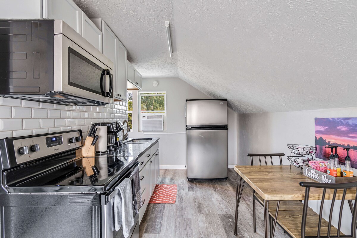 Relájate y desestréstate en este elegante apartamento de estilo loft recién reformado en el histórico barrio de Kenmore Blvd. Situado justo al lado de la autopista y a poca distancia en coche del centro de Akron, encontrarás que este es el lugar perfecto para relajarte mientras visitas el noreste de Ohio. El apartamento cuenta con una planta abierta muy grande, cocina totalmente equipada, zona de lavandería, colchón de espuma viscoelástica nuevo y un baño y medio.