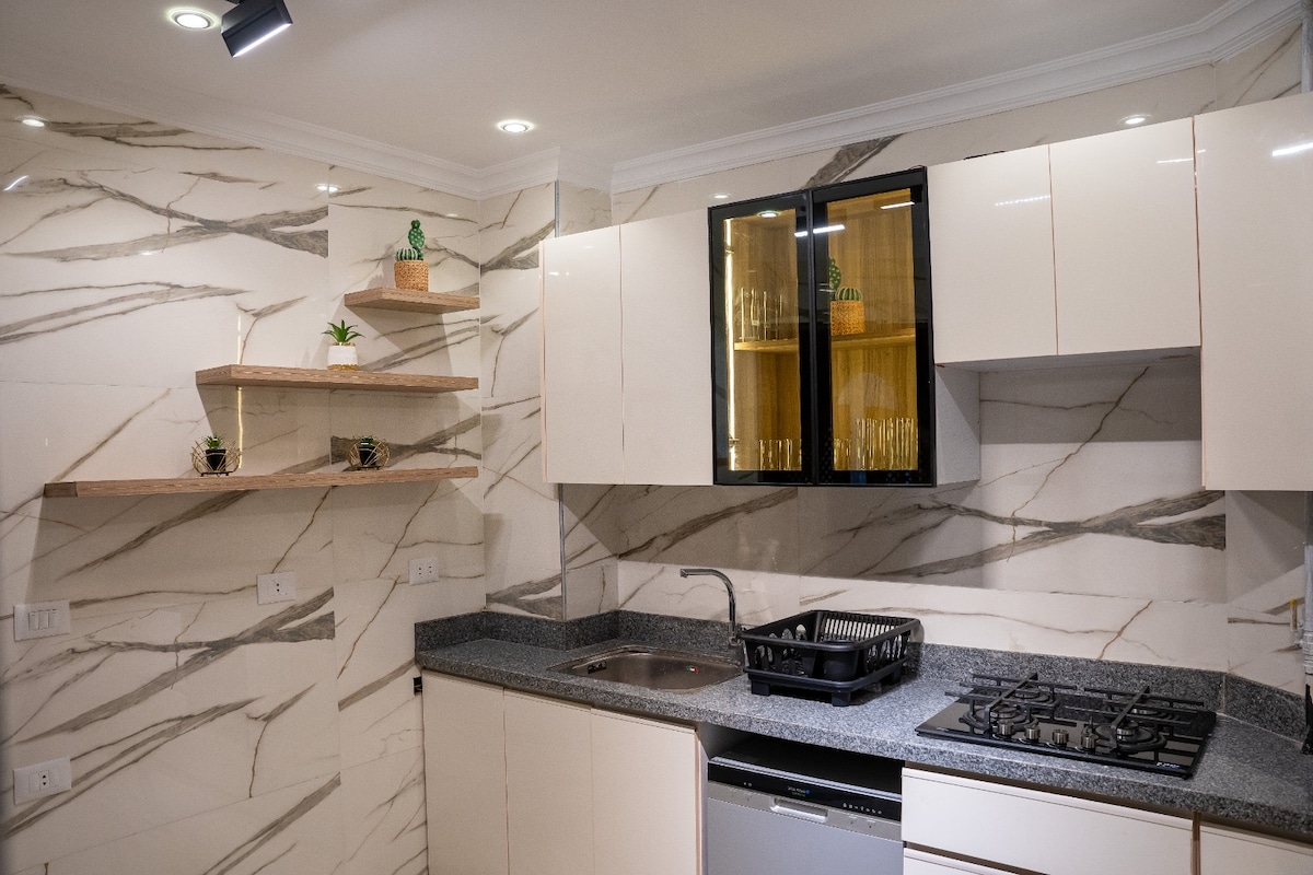 Ubicada en la vibrante Guiza. Nuestra casa ofrece: • Apartamento soleado y espacioso en el 8.º piso • Ascensor moderno y rápido. • Vistas panorámicas del Nilo • A 30 segundos del Nilo. • Paseo marítimo de 4 km con restaurantes y tiendas junto al Nilo. • Smart Tv • Wifi rápido • Electrodomésticos nuevos y aire acondicionado • Ping-pong y juegos de mesa • Registro de entrada autónomo • Portero 24/7 • Atención al huésped las 24 horas, 7 días a • Plaza de aparcamiento en el garaje •Bajo petición: Asistente privado Servicio DE limpieza Visitas guiadas por El Cairo No se permiten huéspedes