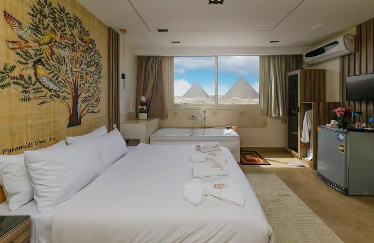 Relájate en una bañera privada mientras disfrutas de unas vistas impresionantes de las grandes pirámides a través de tu ventana. Este elegante estudio es perfecto para parejas o viajeros solitarios, ya que ofrece comodidad, privacidad y un ambiente tranquilo. Con una acogedora cama, un baño moderno y unas vistas inolvidables, es una escapada única a pocos minutos de las pirámides. Descubre Guiza como nunca antes, con lujo y un toque de historia.