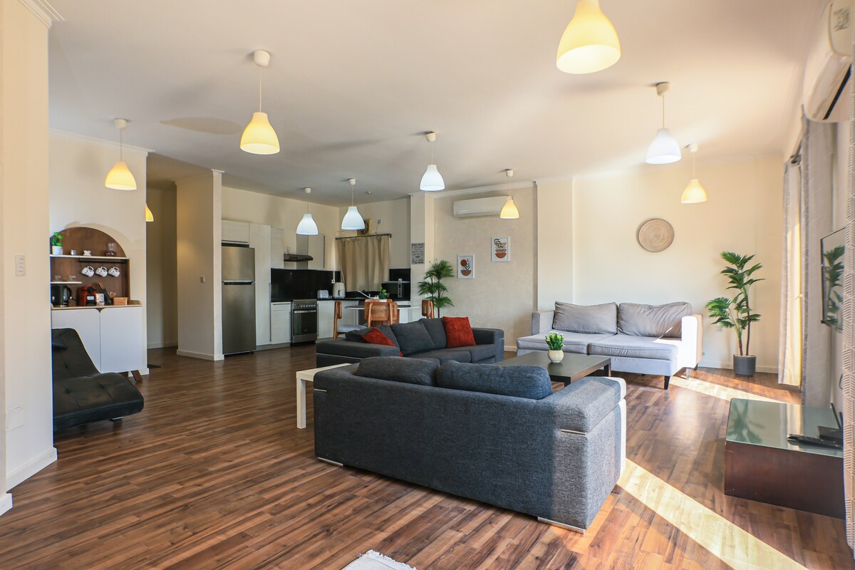 Este elegante apartamento de 2 dormitorios en el corazón del quinto asentamiento ofrece comodidad y conveniencia. Ambos dormitorios principales cuentan con baño privado, uno con cama tamaño king y el otro con dos camas de matrimonio. El espacio incluye una cocina totalmente equipada, comedor, una acogedora sala de estar y una oficina dedicada. A solo 10 minutos en coche del centro de la ciudad, es tranquilo pero cerca de los mejores restaurantes, cafeterías y tiendas. Perfecta para familias, amigos o viajeros de negocios que buscan una estancia relajante.