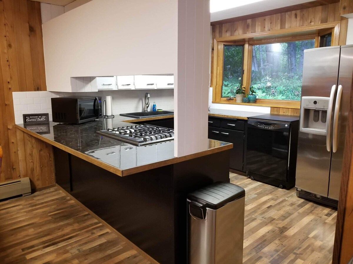 Disfruta de nuestra nueva y acogedora cabaña de 2 dormitorios ubicada en la tranquila zona de Good River y a solo 8 millas del Parque Nacional de Glacier Bay. La cabaña se encuentra en un terreno boscoso con senderos cerca y lo suficientemente cerca como para ir en bicicleta a cualquier parte de la ciudad. La cabaña tiene dos camas tamaño queen, cocina totalmente equipada, sala de estar, baño y lavadora/secadora. Se incluyen ingredientes para un desayuno de tortitas con sirope casero de Spruce Tip. También hay bicicletas gratuitas, barbacoa y un brasero portátil disponibles para su uso.
