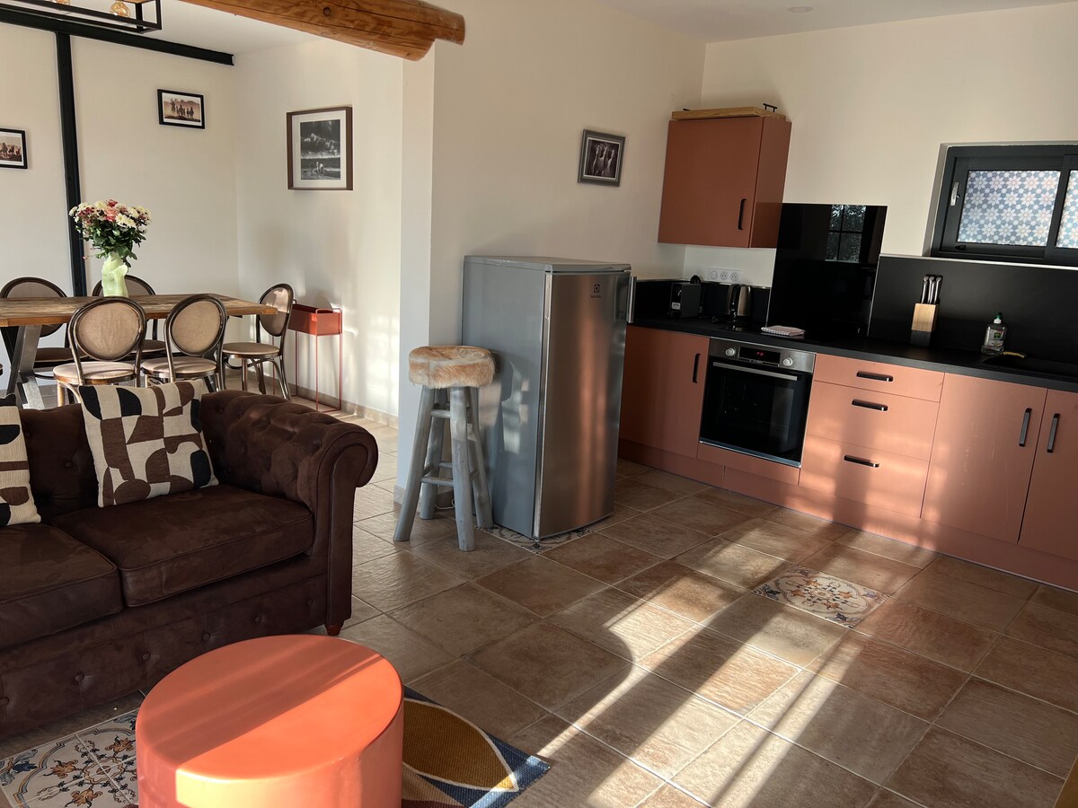 Este tranquilo alojamiento ofrece una estancia relajante para toda la familia. Ideal para 4 personas, con sus dos habitaciones y dos baños, esta casa de planta baja, está orientada al sur, con aire acondicionado. Una terraza privada, te permitirá tomarte el tiempo para escuchar la naturaleza que te rodea, así como los caballos que están en su recinto a pocas cuadras de ti.