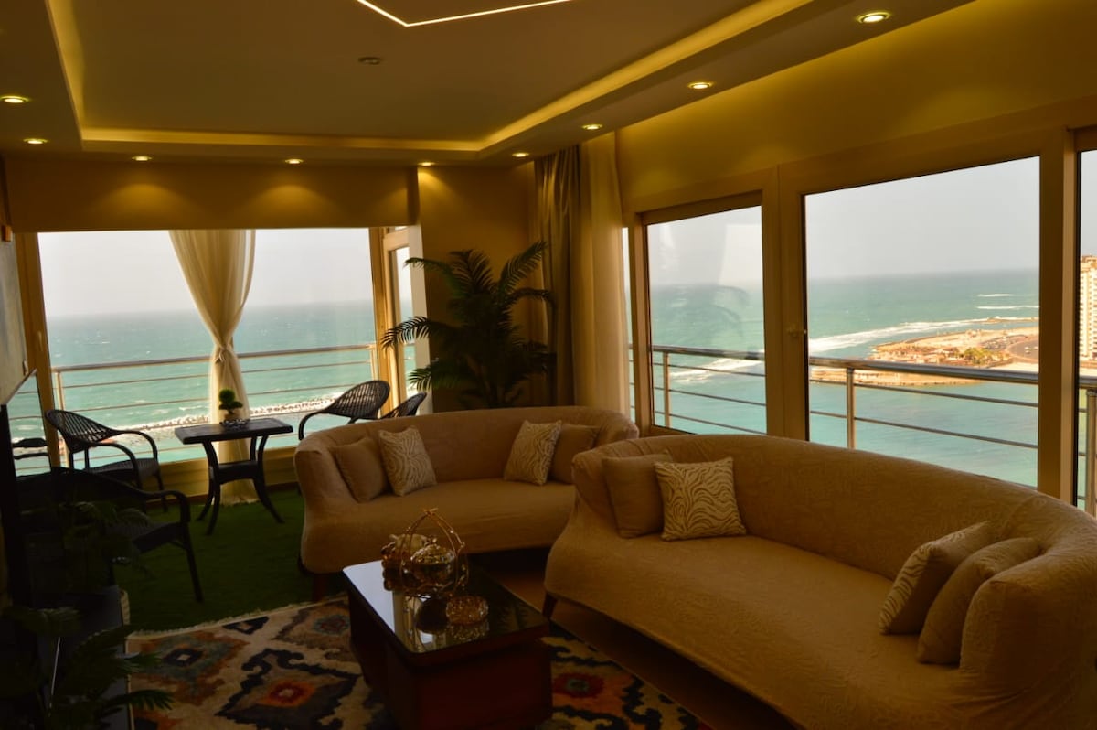 Tu lujoso apartamento mediterráneo en la planta 14 🏖️¡Escapada en Alejandría! Imagina despertarte con vistas panorámicas al mar desde todos los rincones de tu apartamento, incluso desde tu cama Diseñado para maximizar tu experiencia en el mar, este espacioso apartamento es perfecto para .families Una habitación con tres camas de 120 cm. La otra habitación tiene una cama de 120 cm y una cama de 170 cm. «Comedor, recepción, salas de estar ofrecen impresionantes vistas al mar (oeste, norte, este), perfectas para disfrutar de brisas frescas, ideales para empaparse de sol cálido».