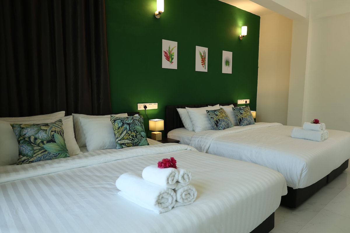 Esta espaciosa habitación familiar cuenta con dos camas tamaño king y una cama individual adicional, que ofrece comodidad para toda la familia. Equipado con comodidades modernas, es el lugar perfecto para relajarse y disfrutar de tu estancia en la hermosa isla de Thoddoo. Los huéspedes también pueden saborear deliciosos platos locales e internacionales en nuestro restaurante en la azotea, donde cada comida viene con una impresionante vista a la isla.