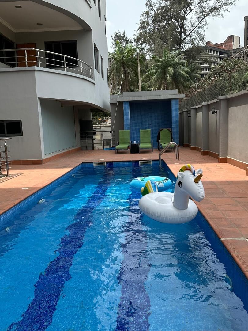 Este elegante alojamiento de 2 dormitorios en Ikoyi ofrece una acogedora sala de estar, una cocina totalmente equipada y dos dormitorios con baño privado con camas ortopédicas tamaño king, un aseo para visitantes, televisores inteligentes, piscina con vistas a la ciudad y gimnasio. Los huéspedes disfrutan de un espacio de trabajo dedicado con wifi rápido, fuente de alimentación y seguridad las 24 horas del día, los 7 días de la semana. Las comodidades premium en el lugar incluyen una cafetería y un salón ejecutivo, cuidadosamente diseñados para mayor comodidad y conveniencia. Perfecto para familias, viajeros de negocios y huéspedes que buscan un espacio seguro y lujoso en Lagos.