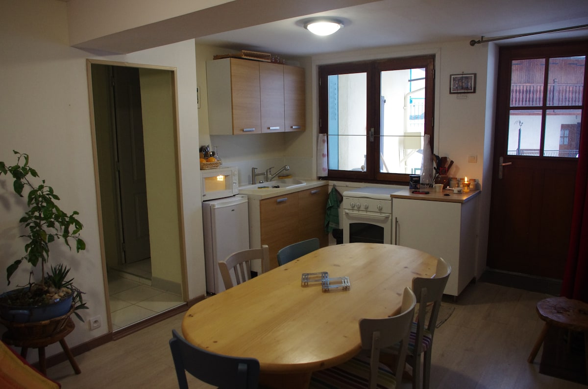Planta baja tranquila para 2-4 personas , 20 M2 , ideal para una pareja o con niños (sin habitación cerrada) estudio totalmente equipado con terraza amueblada, refugio para bicicletas o esquís con candado, plaza de aparcamiento privada, cerca del centro con tienda de comestibles restaurantes, bar, salida de senderismo, ciclista, frente a la parada del servicio de transporte gratuito al teleporte de ALLEMOND a dos minutos en coche: horario en el sitio web de la oficina de turismo .