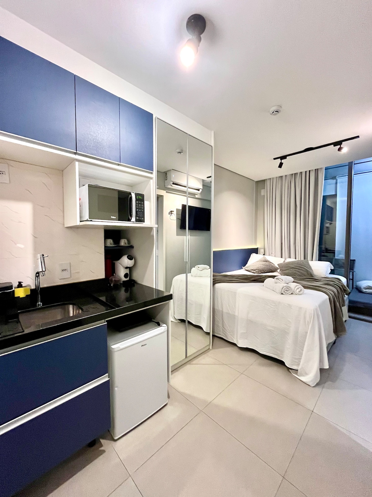 Estudio 40011: a 4 minutos del Allianz Park. Estudio compacto, moderno, completo y cómodo en una de las regiones más culturales de São Paulo. 📍 Rodeado de cafeterías, restaurantes y espectáculos. Aquí late la ciudad ✨ Cama acogedora, encimera, armario, aire acondicionado, TV y cocina equipada con sandwichera, freidora de aire, cafetera, estufa, nevera. 🚿 Baño privado e iluminación acogedora. Con ese ambiente de «quiero quedarme un poco más» Perfecto para disfrutar, descansar o trabajar. ¡Reserva ahora!
