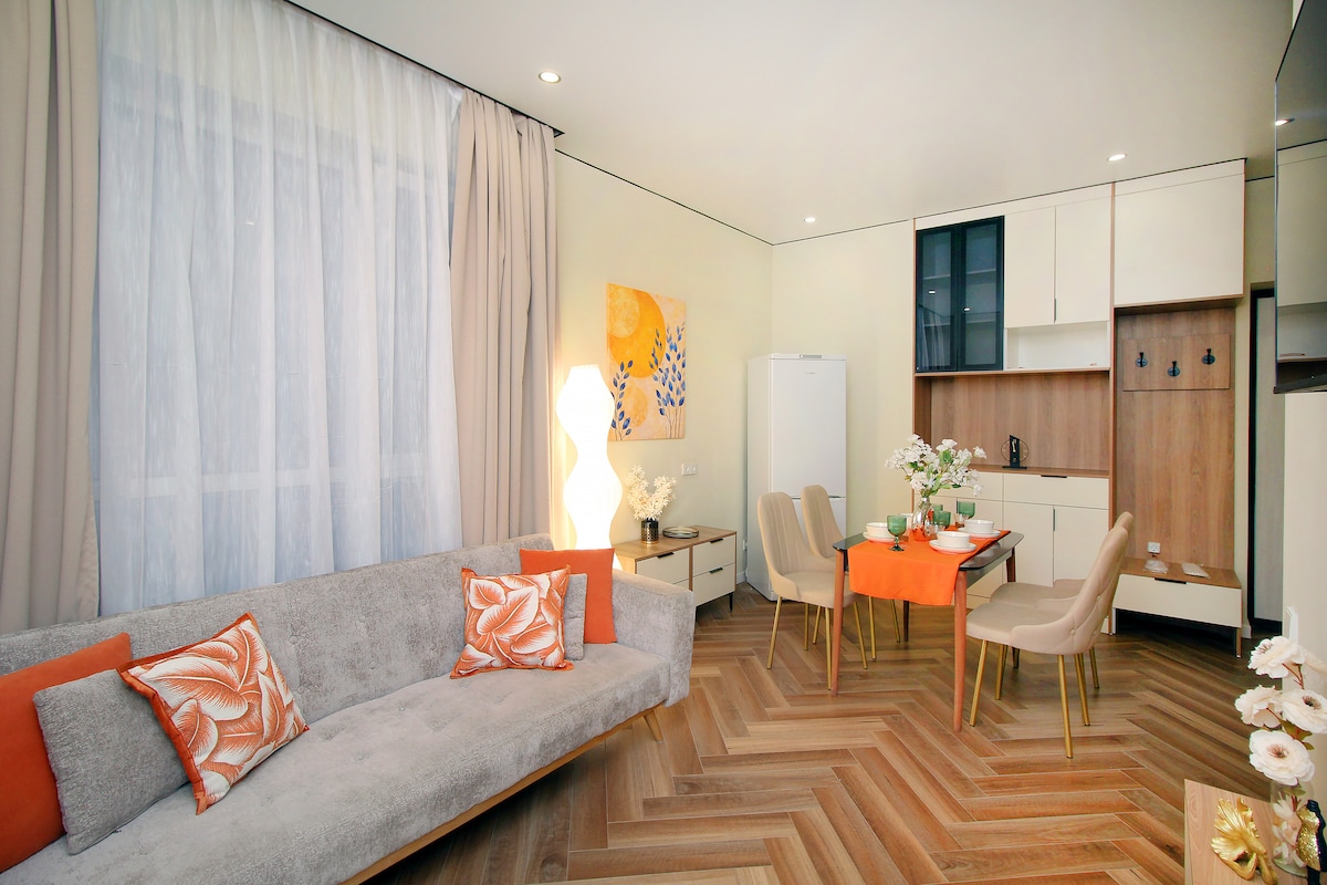 Este acogedor apartamento cuenta con una amplia sala de estar con un cómodo sofá cama y una gran cama con colchón ortopédico en el dormitorio. La cocina está totalmente equipada con lavavajillas, lavadora y todos los utensilios necesarios. Cada habitación tiene aire acondicionado para tu comodidad y el apartamento tiene una vista increíble de la ciudad. El apartamento también incluye un balcón, perfecto para relajarse. Si te gustó nuestro apartamento o aún no has decidido si reservarlo, añádelo a tu lista de favoritos para facilitar el acceso.
