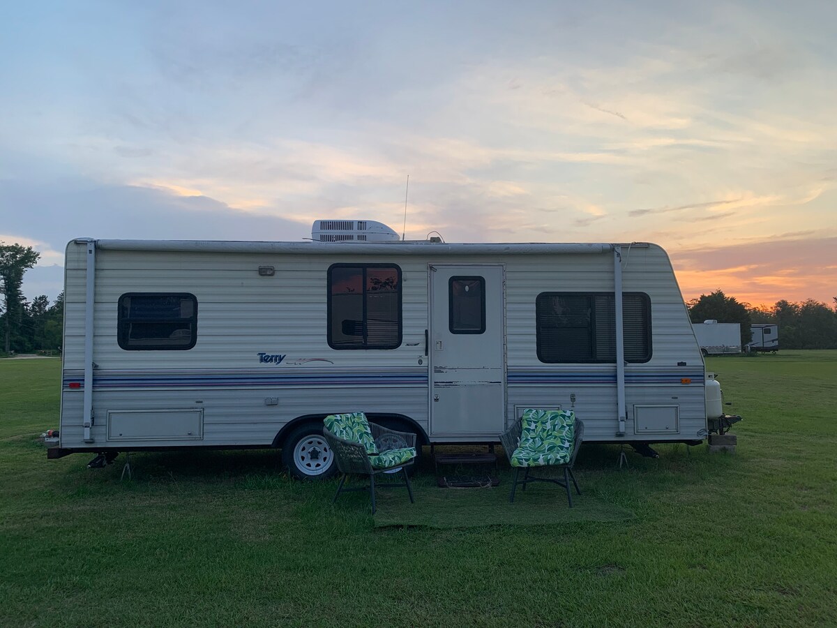 Ubicado a solo 30 millas de los sitios de Savannah, nuestro lugar es ideal tanto para explorar aventuras en la ciudad anfitriona como para disfrutar de las comodidades sencillas de la vida en el campo. Ubicado más allá de una entrada revestida de roble, tu espacio privado escondido en la parte trasera de 1,60 acres de amplio espacio abierto te espera. Disfruta de las mañanas con los pájaros azules del este y los petirrojos y cuentas con noches relajantes dentro de la autocaravana de última generación en los sillones reclinables junto al fuego o fuera junto a las llamas del crepitante fogón.