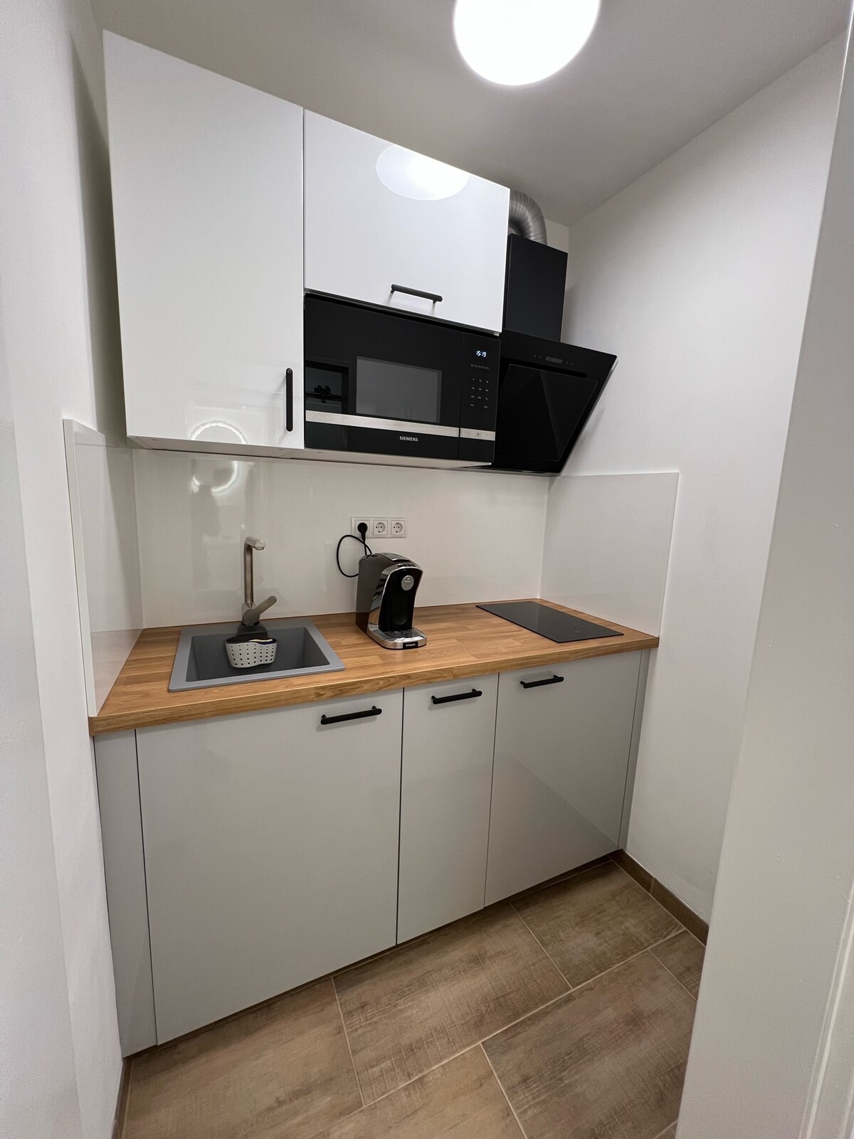 Un acogedor apartamento te espera en una zona de 25 metros cuadrados. El apartamento fue completamente renovado y renovado por nosotros en el 2022. Además de una cómoda cama tamaño queen (160 cm), la sala de estar/dormitorio tiene una acogedora zona de comedor y un televisor grande. También hay una pequeña cocina que incluye un lavavajillas, una nevera y un mini horno. El baño también ha sido renovado. Encima tienes la oportunidad de pasar horas relajantes en el gran balcón soleado.