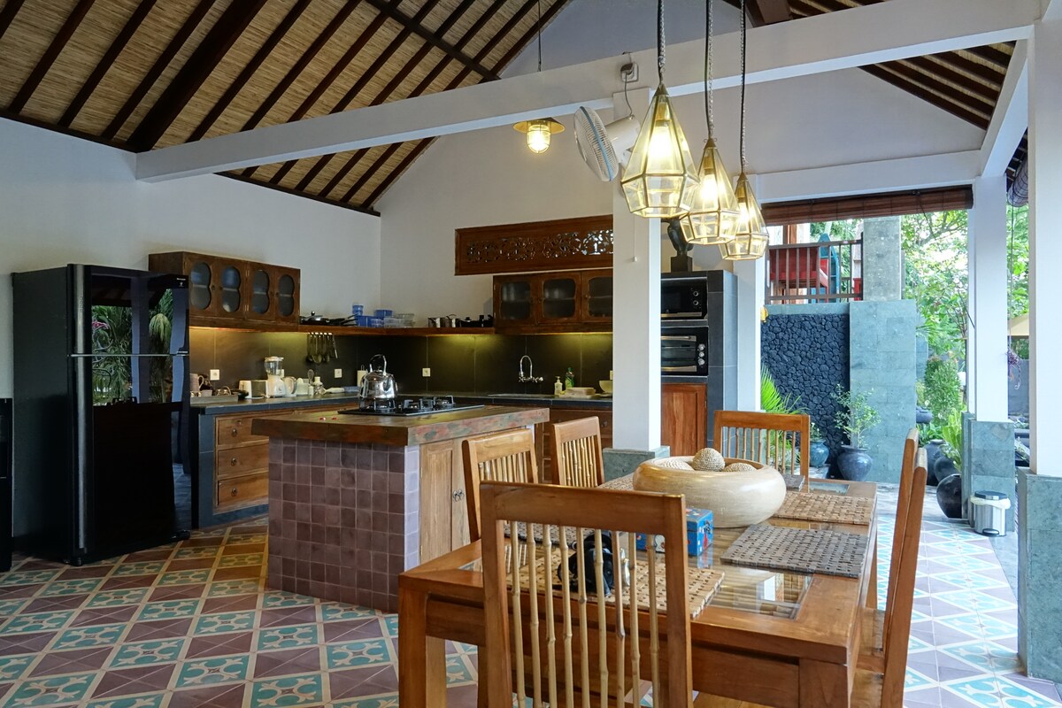 Tu propia casa de playa con piscina. Perfecto para unas vacaciones familiares, tiempo de calidad con un grupo o una escapada romántica. 3 dormitorios con aire acondicionado, 3 baños. Nada en una piscina de 10 metros de largo, salta al océano. Algunos de los mejores lugares para bucear y hacer snorkel en la costa están justo a la salida. Relájate y rejuvenece en una variedad de encantadores espacios privados, el balcón con cojines y pérgola y la piscina con tumbonas y hamacas. El propietario/chef es famoso por tener la mejor comida balinesa de Bali, servida junto al mar.