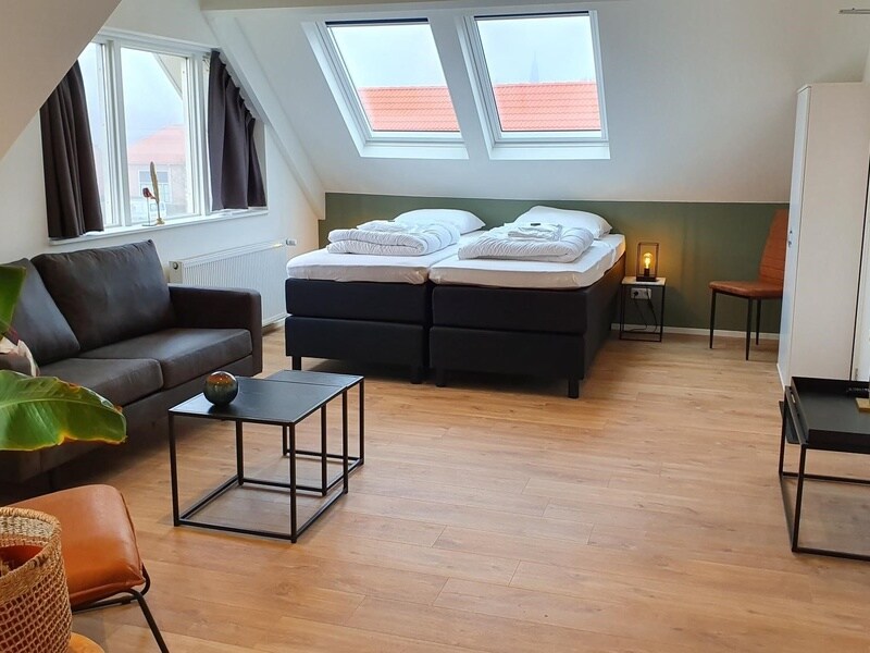Alojamiento céntrico en el segundo piso con vistas al puerto a lo lejos. Bonita ducha, aseo independiente y 2 dormitorios, 1 con somier individual de 90 x 2,10 m y 1 con cama doble Auping, también de 2,10 m de largo. Debido a las paredes inclinadas no es apto para colocar una cuna, por lo que es para un máximo de 3 adultos. La cocina abierta tiene lavavajillas, horno y cafetera Nespresso. El precio del alquiler incluye camas, toallas, tarifa de limpieza y mediación de Airbnb del 14%.