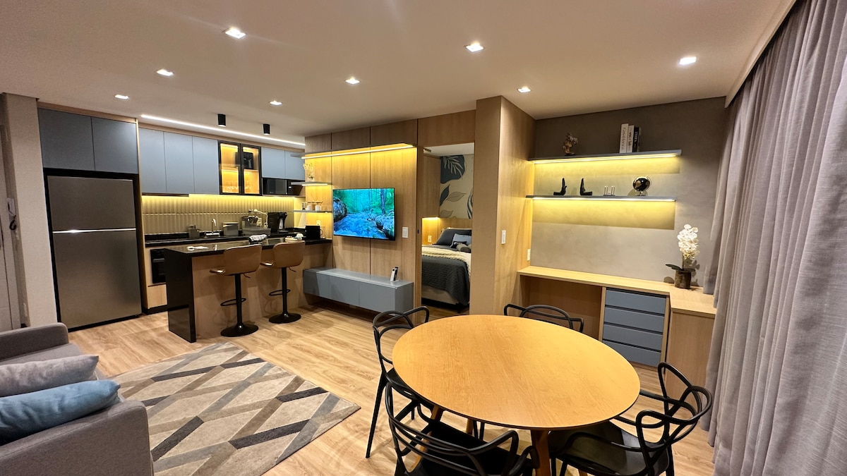 Este encantador apartamento é a escolha perfeita para quem busca conforto e elegância. Com 1 dormitório, dispõe de um armário planejado e ar condicionado. Banheiro social moderno com um espelho amplo. A sala de estar com TV e sofá cama retrátil bem confortável para mais 2 pessoas. A cozinha é prática e bem equipada com geladeira, liquidificador, micro-ondas, fogão cooktop (forno desativado), máquina de lavar. Uma sacada que lhe dará uma visão linda da cidade.