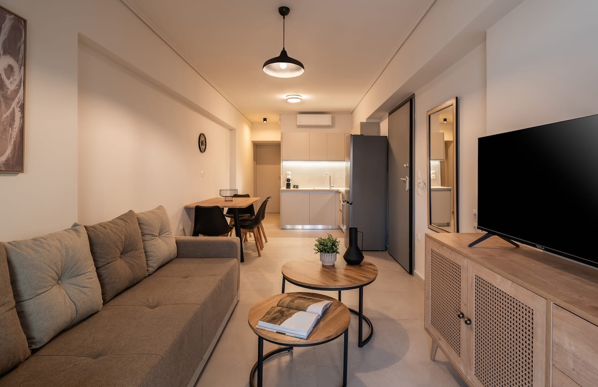 Disfruta de una experiencia de lujo en uno de los barrios más animados de Atenas. Nuestro apartamento de un (1) dormitorio totalmente renovado se encuentra en el cuarto piso de un establecimiento residencial que ofrece un ambiente hogareño, vistas a la Acrópolis desde el patio y fácil acceso a las atracciones más famosas de la ciudad. El soleado apartamento cuenta con todos los servicios necesarios para estancias largas, y el colchón especial es el punto culminante para un sueño cómodo.