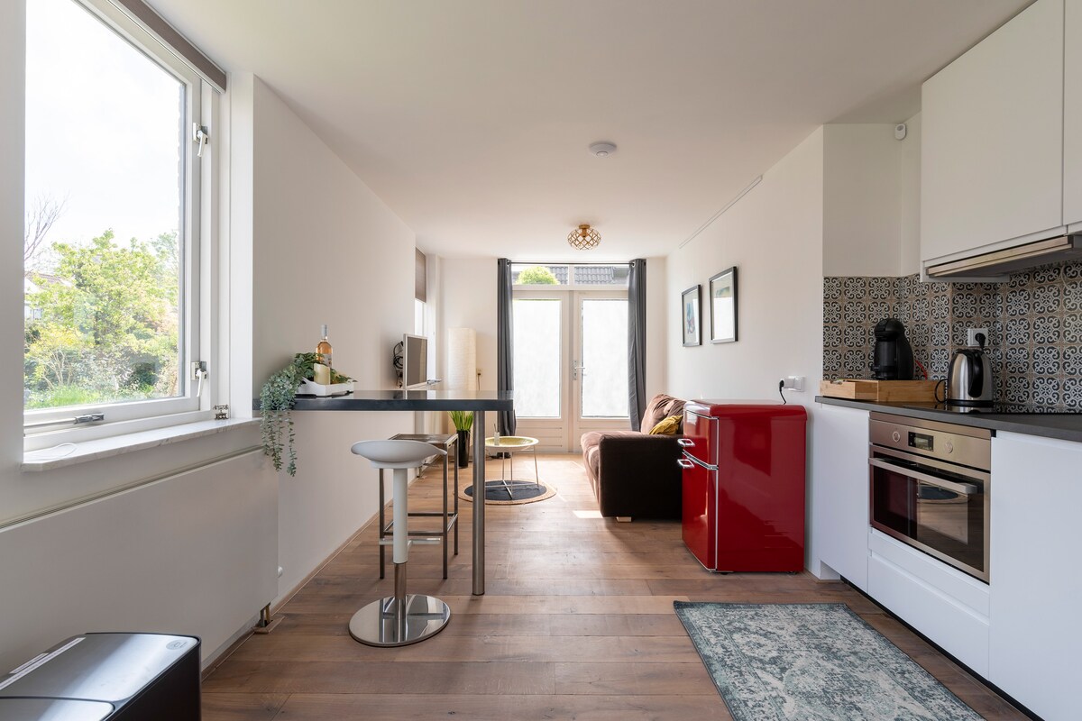 Apartamento estudio acogedor de diseño privado de mediados de siglo/moderno con detalles de lujo, como parte de nuestra casa más grande. Plaza de los Museos a la vuelta de la esquina con todos los museos, el famoso mercado fresco Albert Cuyp y diversos restaurantes y cafeterías para desayunar/almorzar/cenar a pocos minutos a pie. ¡Lo mejor que ofrece el centro de la ciudad! ・ Ideal para 2 huéspedes. ・ Puedes reservar con 3 meses de antelación ・ Incluye nevera, utensilios de cocina, etc., pero no cocina completa (por ejemplo, microondas) ・ Encuentra nuestros consejos de la ciudad en la guía