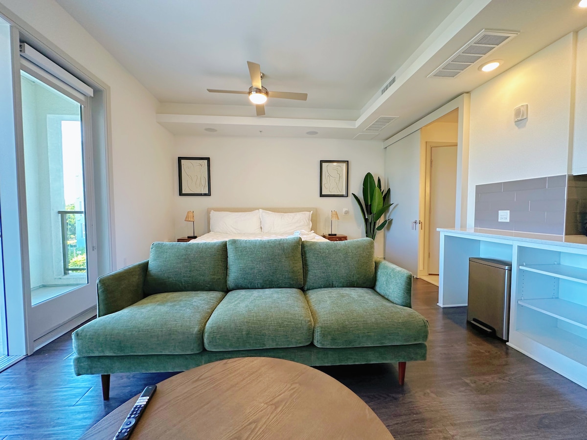 Aproximadamente 650 pies cuadrados. Estudio. Cómoda cama king size. Capacidad para 2 personas cómodamente, opcional para un tercer huésped a tu discreción. Amplio espacio en el armario. Smart TV para que puedas iniciar sesión en tus aplicaciones de televisión favoritas. Sofá, mesa de café y cómoda en el dormitorio/salón de concepto abierto. Cocina completa. WiFi rápido. Lavadora/secadora (detergente) gratuita en la unidad. Frigorífico con máquina de hielo. Hervidor de vidrio (café instantáneo). Completamente desinfectado y limpio. Este no es un alojamiento compartido. Disfruta