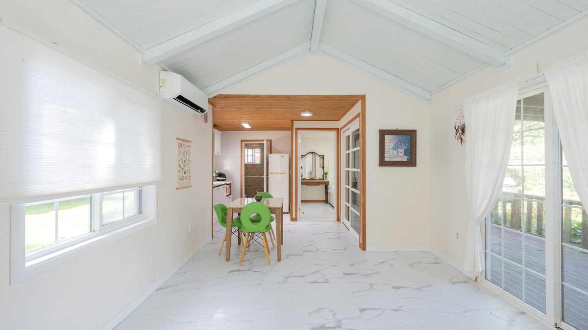 Es una casa de campo de dos pisos en la cima de una colina de Nazmak, justo al lado del mar. El primer piso donde te alojarás tiene una entrada privada, por lo que puedes utilizar todo el primer piso (26 pyeong) como espacio independiente, y el segundo piso está ocupado por la pareja anfitriona. Está al oeste, pero es moderna, por lo que puedes ver el amanecer desde el interior de la casa por la mañana, hay un arboreto cerca y la cueva de estilo marino de la playa de Padori está cerca, por lo que puedes disfrutar de muchos ambientes diferentes. Sin embargo, como no es un pueblo de alojamiento, sino en un tranquilo pueblo de pescadores, me gustaría invitar a los huéspedes que quieran un viaje de sanación en la naturaleza. Lo siento, pero si estás planeando un viaje de reunión animada, te recomiendo respetuosamente el alojamiento en otros complejos de pensionistas especializados. También hay tres perros muy mansos que viven en el segundo piso, así que si quieres pasar tiempo con tu perro, avísanos con antelación y te proporcionaremos un tiempo de curación con el cachorro. ¡Todos los que ven este artículo tienen una sonrisa brillante, se mantienen saludables y pasan un tiempo feliz y precioso! ¡Gracias!