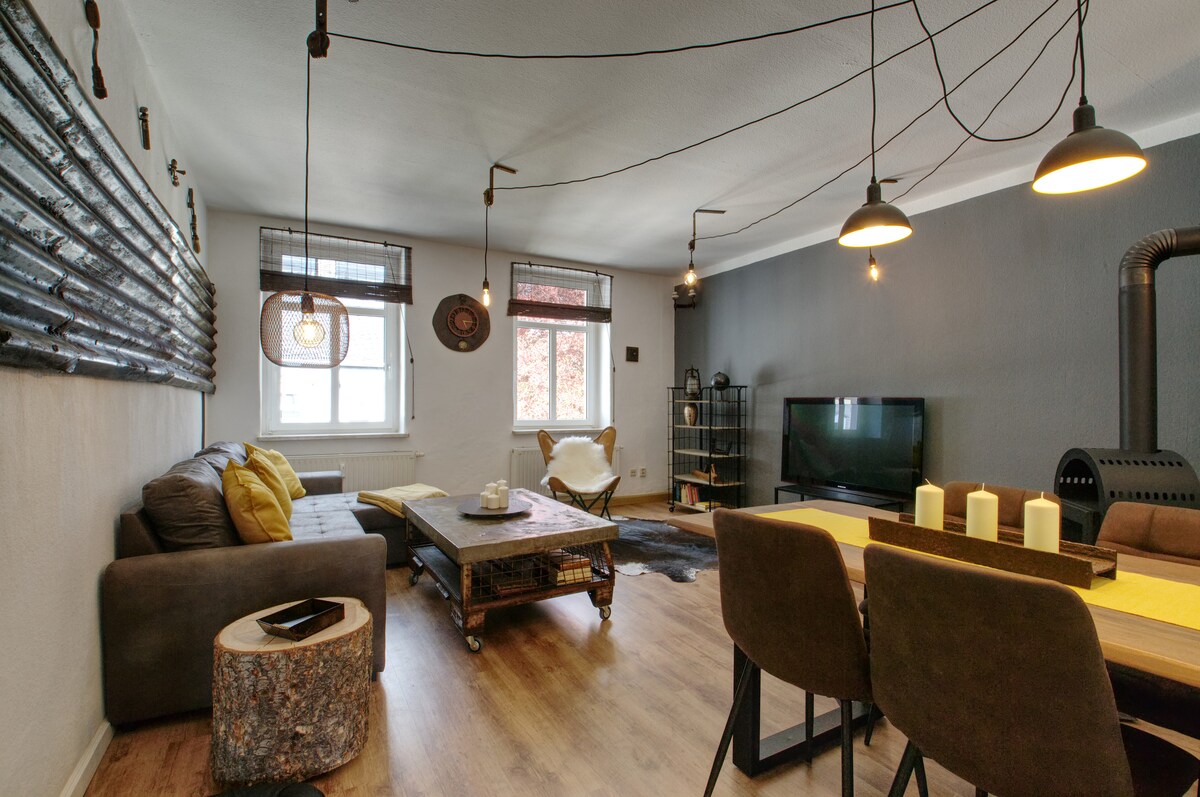 El Loft Studio Annaberg es un espacioso apartamento urbano en el centro de Annaberg-Buchholz para un máximo de 4 personas. Lo más destacado de esta casa de diseño industrial son la chimenea para noches acogedoras junto al fuego ardiente y la gran terraza con una amplia vista de St. Annenkirche a Keilberg y Fichtelberg. El apartamento es apto para 2 a 4 personas. En Loft Studio Annaberg puedes irte de vacaciones con tu amigo de cuatro patas. Hay conexión Wi-Fi gratuita disponible.