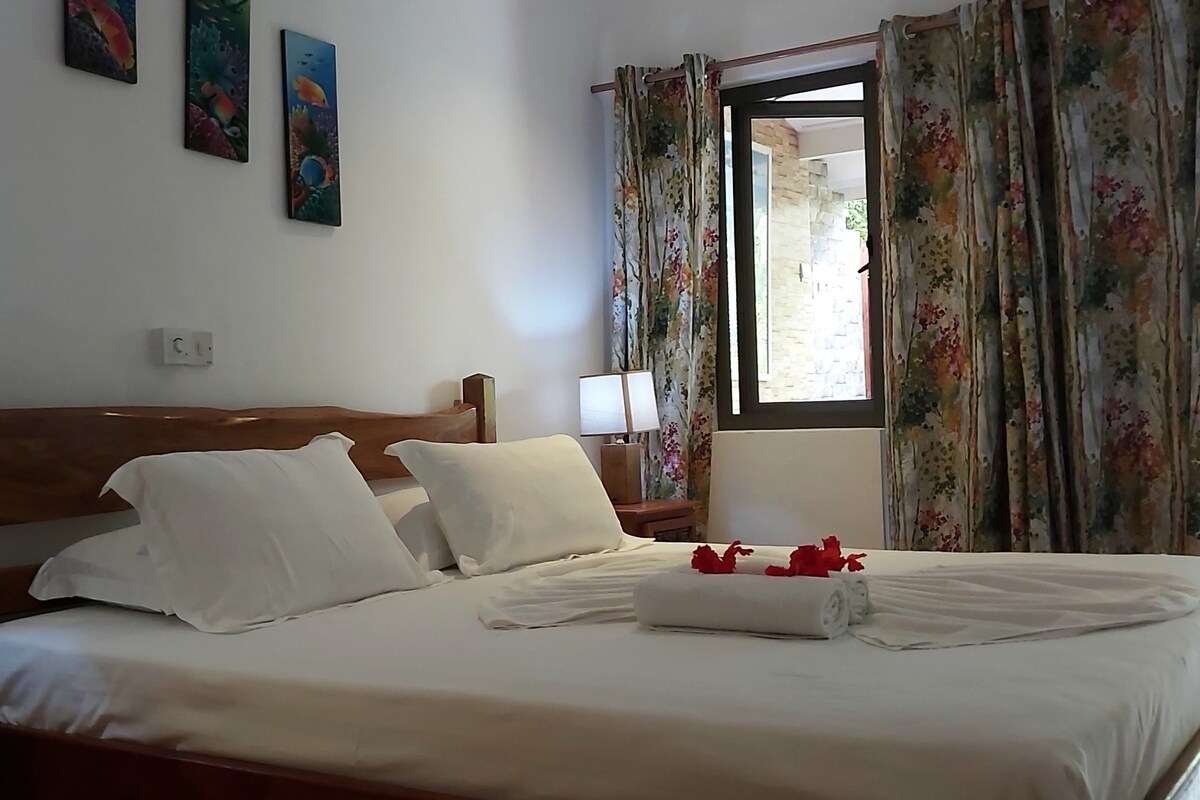 "PraslinParadise" is 80m from the beach and close to everything from dive centers to supermarkets all in walkable distance along the main walkway of cote dor . This room has fan in living room and aircon in bedroom with ensuite bathroom for every room. There is a private balcony where you can smoke or enjoy company! The kitchen is equipped with all the neccesary to make your own meals you can enjoy with those special to you. Very quiet area surrounded by little garden