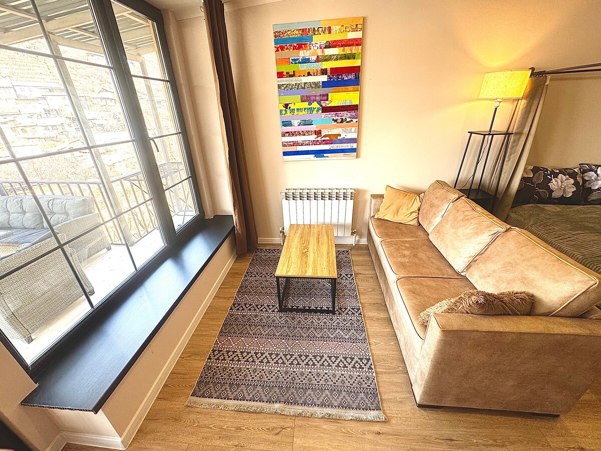 Estudio cómodo con todo lo necesario para vivir, descansar o trabajar. El estudio está situado cerca del centro de la ciudad, a solo 15 minutos a pie del centro principal de Ereván. 3er piso de la casa, con terraza y maravillosa vista a la ciudad. Aunque es un lugar céntrico, puedes disfrutar de tu tiempo en el jardín verde y oler el aire fresco, porque la casa está situada en medio de muchos jardines. Planeamos el estudio y lo equipamos con todo lo que los huéspedes puedan necesitar.