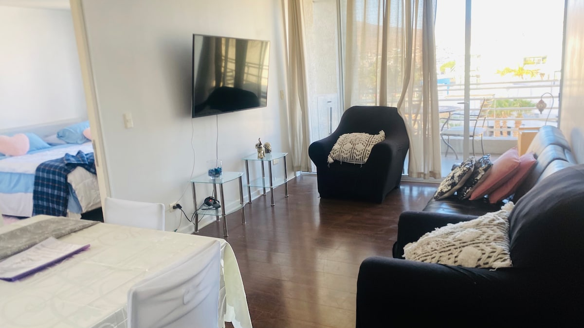 Depto., ideal para hasta 6 personas. Próximo al sector costero y sus paseos peatonales recién inaugurados. Amoblado completo: -Cocina con freezer, lavadora, horno eléctrico etc. -Sala principal con comedor para 4 personas, dos pisos giratorios, Sofá cama, Smart tv. -Balcón equipado para dos personas. -Habitación principal posee una cama doble, Smart TV, veladores con lámparas y un amplio closet. -La 2da habitación cuenta con una cama nido y closet. -La 3ra habitación con una cama de 1,5 plazas.