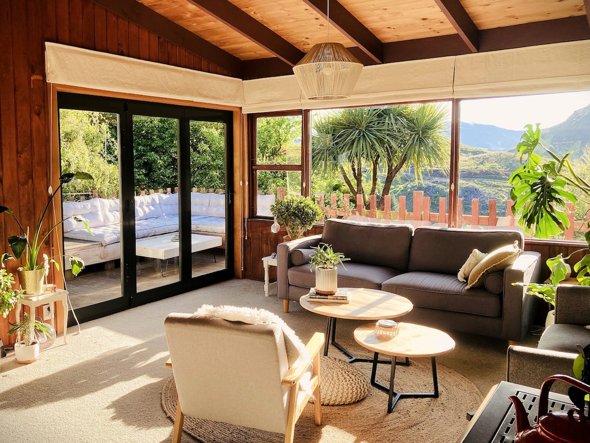 En la colina de Arthurs Point, rodeada de árboles autóctonos. Cerca de la estación de esquí Coronet, a pocos pasos del río Shotover, a 7 minutos en coche o autobús del corazón de Queenstown y a 5 minutos en bicicleta de la pista Moonlight. ¿Qué más se puede pedir? Ideal para familias, cálido, soleado y perfecto para verano o invierno. 3 dormitorios y 2 baños: dormitorio principal en la planta baja con baño privado, un dormitorio queen en la planta superior y una tercera habitación con dos camas individuales tamaño king.