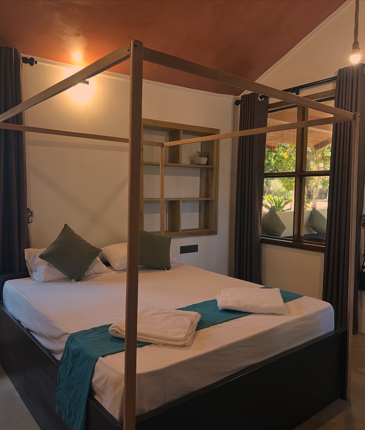 Esta habitación de madera, con un diseño precioso, ofrece un ambiente cálido y relajante, perfecto para surfistas, parejas y viajeros que buscan comodidad y tranquilidad. La habitación cuenta con un techo alto de madera, una iluminación elegante y elementos interiores de madera hechos a mano, lo que crea un ambiente tropical acogedor a la vez que ofrece un confort moderno. Los huéspedes pueden disfrutar de un dormitorio amplio, una cómoda cama tamaño king, aire acondicionado y un baño privado en la habitación con agua caliente.