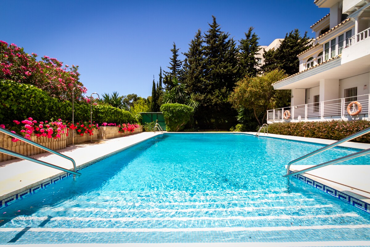 Acogedor apartamento de 120 m2, planta baja , 2 dormitorios y con jardín individual y salida a amplios jardines comunitarios, situado en magnifica urbanización de lujo con 5 piscinas, una de ellas climatizada en invierno, seguridad 24 horas, pistas de tenis y paddel. Ubicado en la nueva Milla de Oro de la Costa del Sol, junto a campos de golf (Guadalmina, Atalaya), a 5 minutos a pie de la playa, a 5 minutos en coche al Puerto Banús y Benahavis y a 10 minutos de Marbella y Estepona.