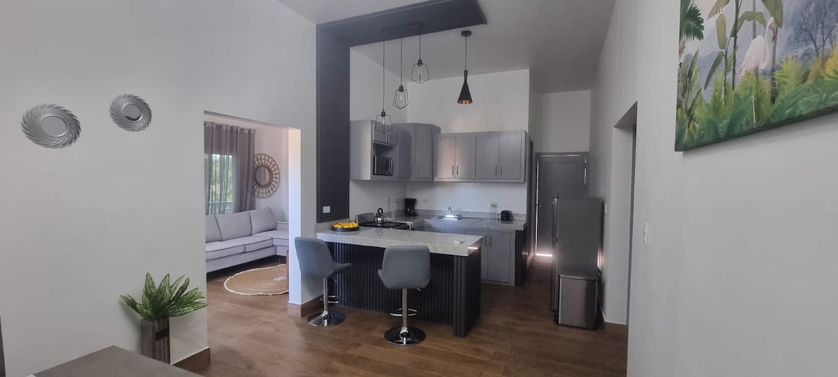 Disfruta de una estancia única en este moderno apartamento con acabados de lujo, diseñado para brindar comodidad, elegancia y una experiencia inolvidable. Perfecto para familias, parejas o viajes de negocios. Excelente Ubicacion a solo 3 minutos de la playa de TelaMar, cuenta con piscina compartida para todo el complejo, ubicado en la avenida principal donde esta el aeropuerto cerca de restaurantes, minisuper y tiendas de conveniencia.
