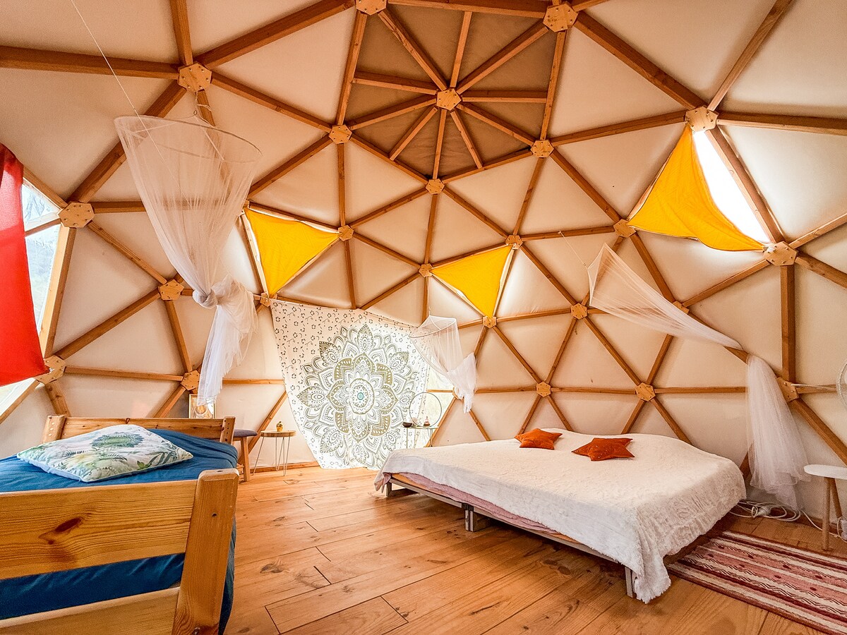 ¿Le apetece un momento a 2? Venga a descubrir este lugar en corazón de la naturaleza. Un remanso de paz para soltar y acercarse a la naturaleza. Una vista de nuestra montaña sagrada el Canigou y un amanecer en la llanura del Rosellón nuestra hermosa costa catalana Esta cúpula geodésica ha sido realizada por un taller de carpintería a escala humana en los Alpes. La cama ha sido hecha a mano por un amante de la naturaleza. Estaremos encantados de recibirte en este lugar excepcional 💕