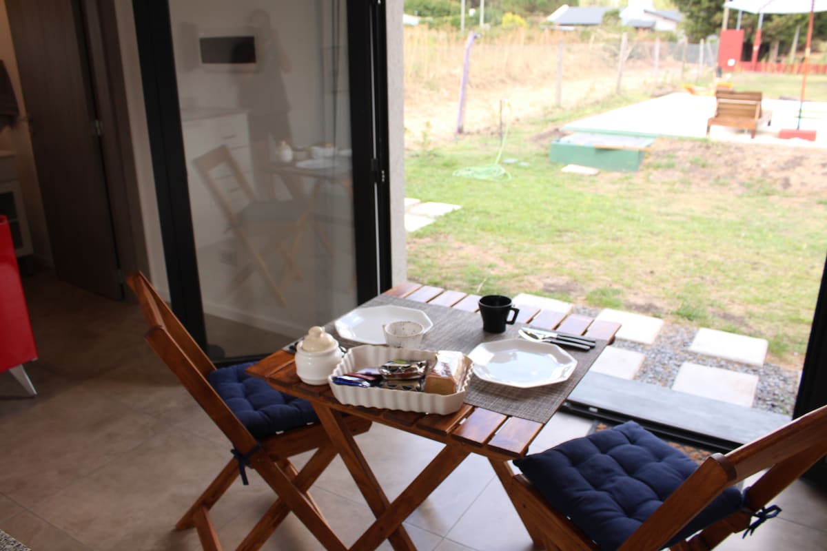 Alojamiento ubicado en un predio tranquilo, muy cerca de las sierras de Tandil. El espacio es integrado y cuenta con cama matrimonial, aire acondicionado frío-calor, baño privado con ducha y cocina equipada con heladera, anafe eléctrico doble, horno, pava eléctrica y utensilios básicos. Pileta compartida con otros alojamientos (no climatizada). Cada unidad dispone de parrilla exterior individual y estacionamiento propio.