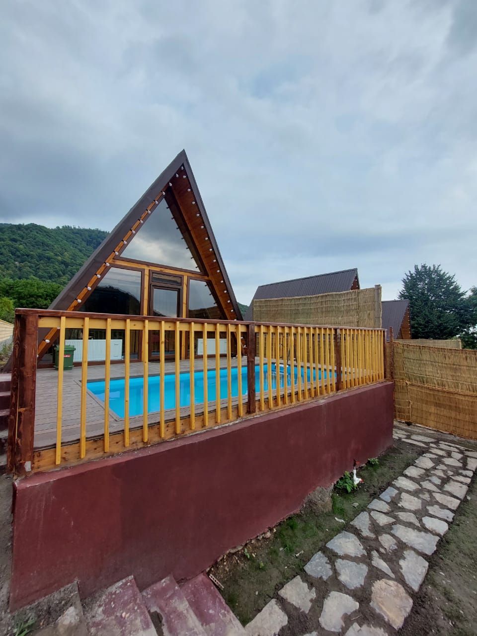 Aframe Villa located is Qemervan village, far from center of Gabala, 20 minutes include 1 bedroom, 2 beds, ac, super mountain scenery heated swimming pool, river sounds