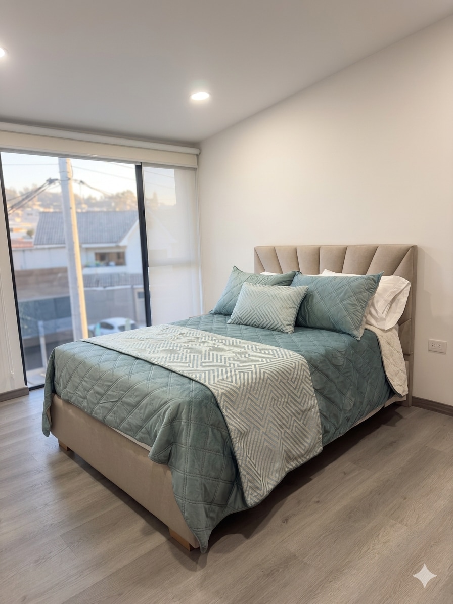 Este elegante alojamiento es ideal para noches de pareja, familia corta o estadías largas de trabajo. Contamos con jacuzzi dentro del departamento, chimenea de bioetanol y una sala con una pantalla de 85” para las mejores noches y experiencias inolvidables de sus vacaciones. Cama tamaño king y hermosos balcones. Cocina propia con todos los implementos necesarios. Cerca de lavanderías, tiendas, restaurantes. Parqueadero propio y cámaras con vista a la calle para su tranquilidad.