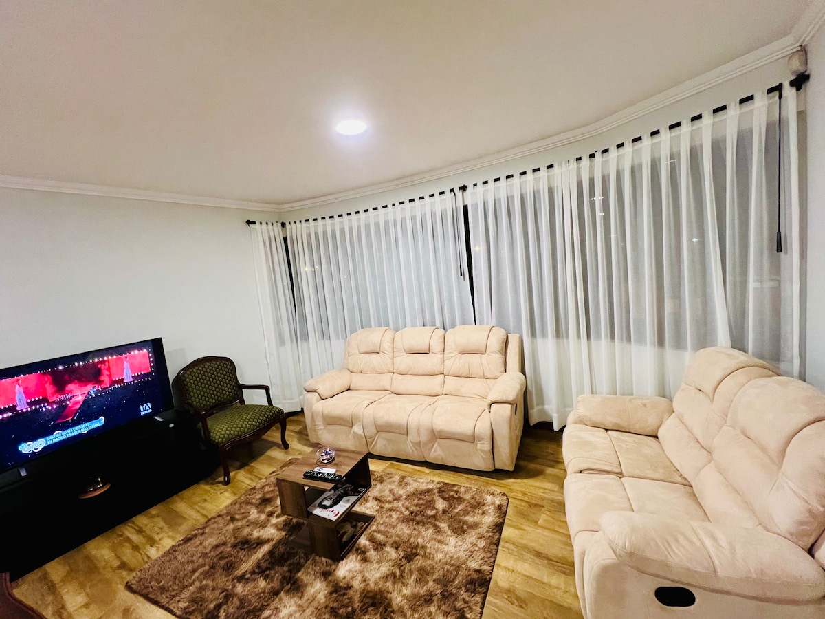 Amplio departamento amoblado y elegante ubicado al sur de cuenca a 10 minutos del centro histórico de cuenca, 5 habitaciones amplias con televisión, 3 baños, wifi, alexa, agua potable, área de recreación con mesa de ping pong, juegos de mesa, proyector para películas Apple TV, PlayStation 4 cocina bien equipada 3 azoteas para disfrutar de una excelente vista a la ciudad, zona de fogata y bbq además de Lavanderia, parqueadero privado, un lugar seguro y tranquilo para relajarte con toda la familia
