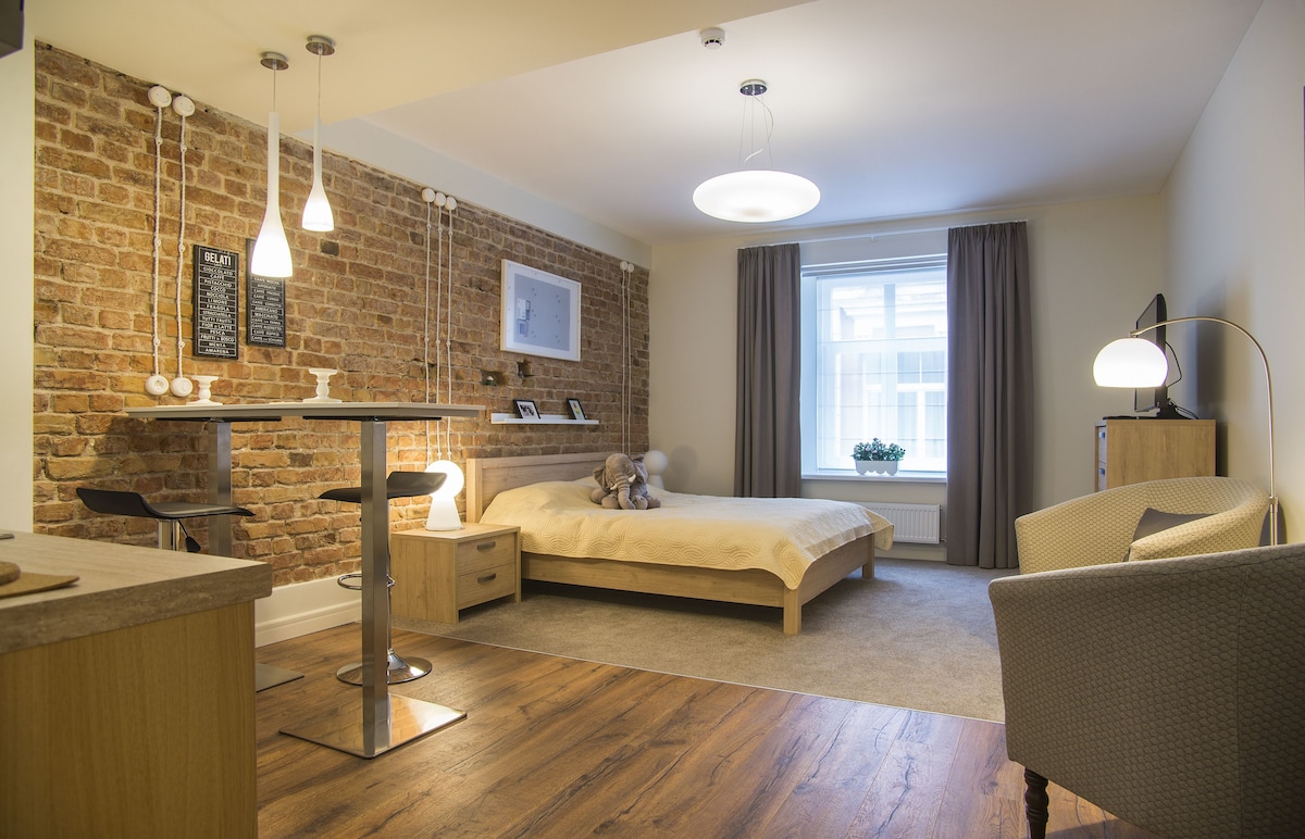 El hotel cuenta con 3 apartamentos tipo estudio. Estos son apartamentos elegantes que van desde los 28 hasta los 31 metros cuadrados con comodidades bien pensadas que son ideales para 1 o 2 huéspedes que vienen a Riga por placer o negocios. Nuestro hotel no cuenta con ascensor, ya que se encuentra en un edificio histórico de cinco plantas construido en 1898, que también es Patrimonio de la Humanidad de la UNESCO.