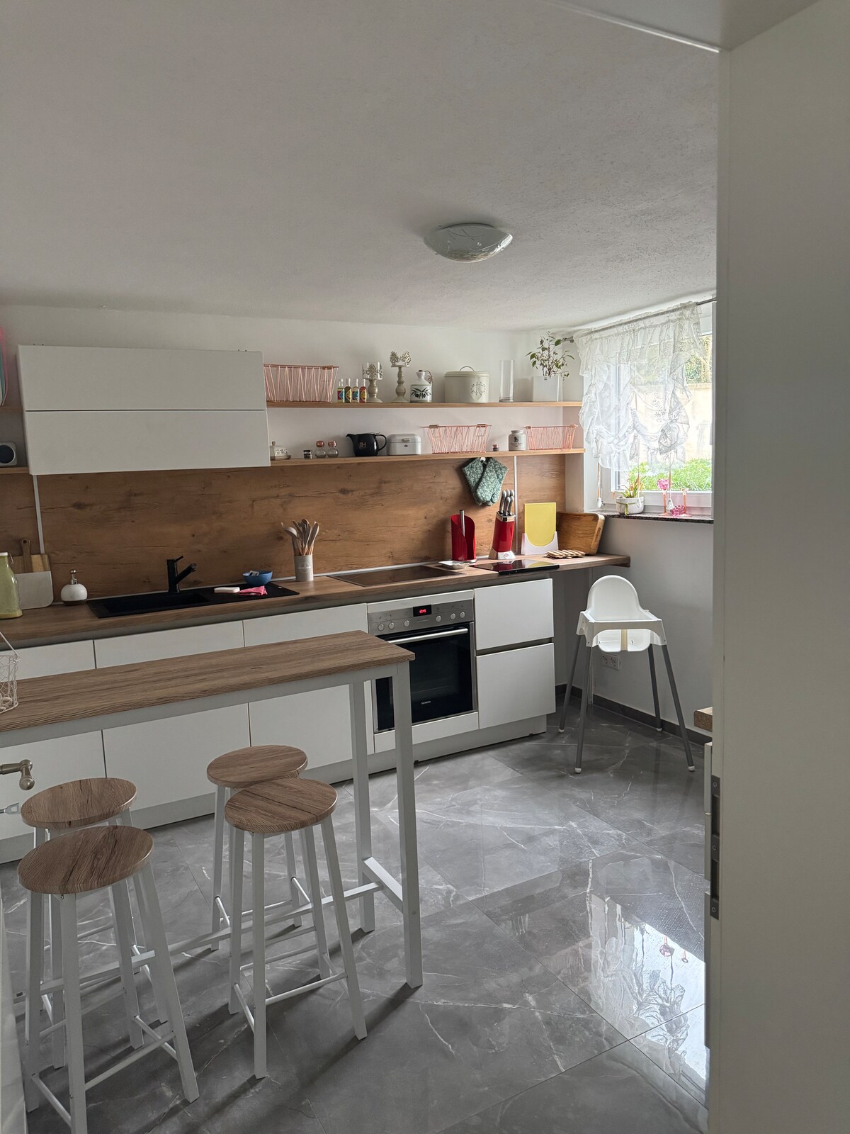 En la media bodega con grandes ventanales diurnos, junto a una cocina-salón, hay un dormitorio doble y un baño. El sofá se puede convertir en un sofá cama para el tercer y cuarto huésped. La cocina ofrece amplios servicios, donde podrás relajarte y cocinar. En el baño, además de la ducha a ras de suelo, también hay un gran tocador y un aseo. Una lavadora también forma parte del equipo. Nos vemos prontito. Familia Richter