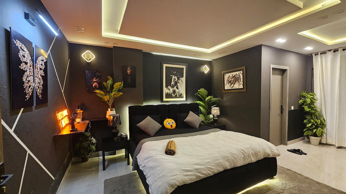 Bienvenido a Midnight Luxe Suite, un apartamento cinematográfico de temática negra cuidadosamente diseñado, situado en el corazón de Bahria Town Lahore. Este elegante espacio cuenta con un lujoso dormitorio de diseño con techo LED ambiental e iluminación de cama, creando un ambiente cálido e íntimo perfecto para familias, creativos y viajeros de negocios. La moderna sala de estar incluye una decoración elegante, una acogedora zona de estar y un televisor inteligente montado en la pared para las noches de Netflix. El apartamento también ofrece una cocina americana moderna y compacta.