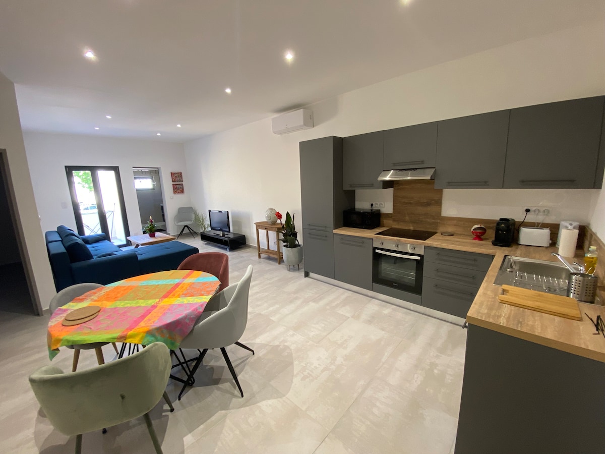 Relájese en el Jasmin en este alojamiento en planta baja tranquilo y elegante totalmente renovado con todas las comodidades ideal para una estancia de curación, vacaciones o fin de semana cerca del centro y del estanque de thau descripción del alojamiento: T2 con dormitorio separado en la planta baja cama cómoda 140 colchón bultex vestidor cuarto de baño con ducha cocina totalmente equipada con zona de comedor zona de estar sofá y mesa baja lavadora aire acondicionado tv de pantalla plana exterior jardín