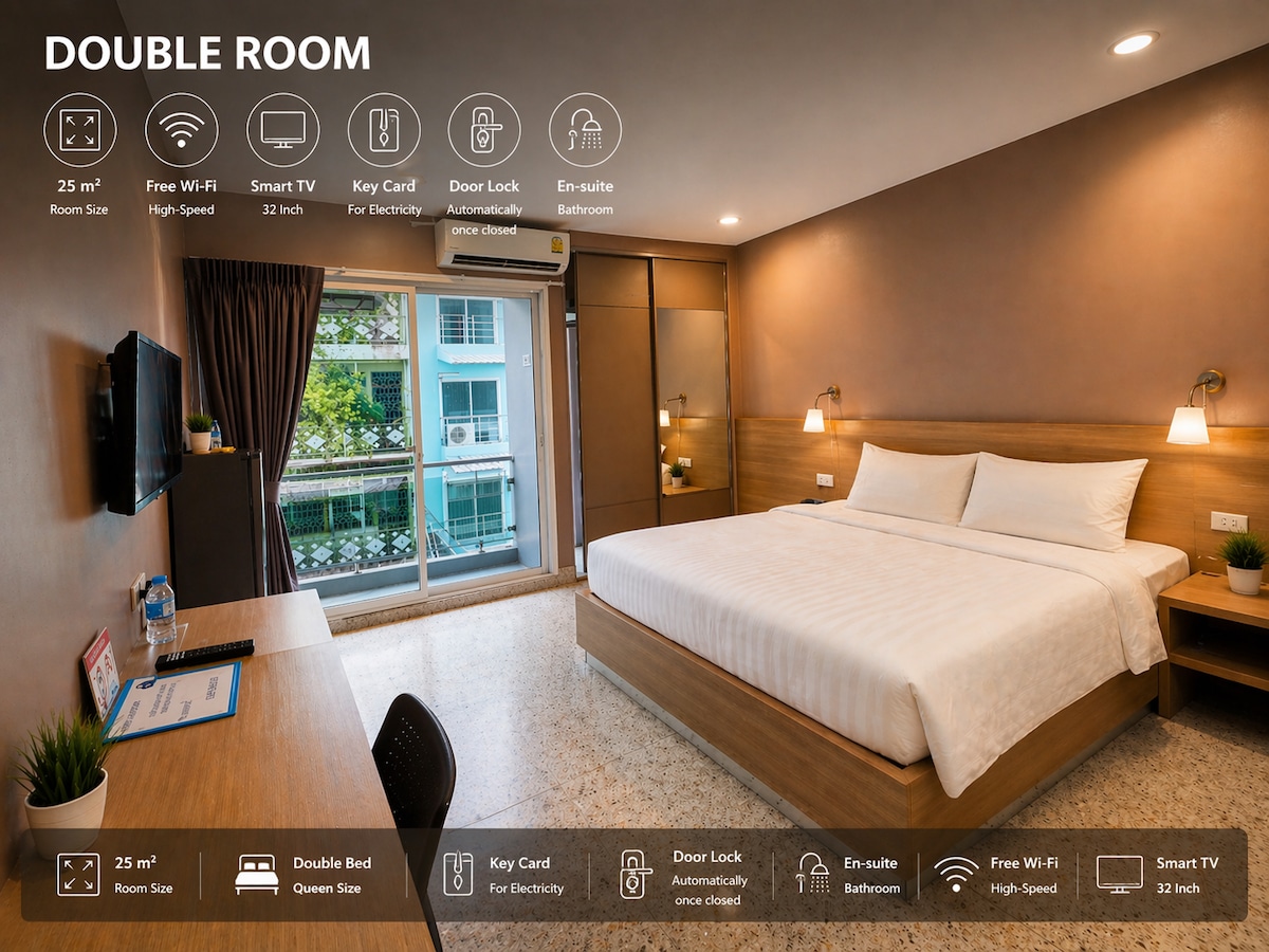 La habitación doble superior tiene capacidad para 2 personas con una cama tamaño queen y un colchón de calidad de hotel de 5 estrellas. Disfruta de un diseño moderno y minimalista con aire acondicionado, TV de pantalla plana, nevera, escritorio y conexión wifi de alta velocidad gratuita. Ubicado en una zona tranquila, a solo 15 minutos a pie de MBK y Siam Center, perfecto para viajeros que buscan comodidad, valor y conveniencia en el centro de Bangkok.