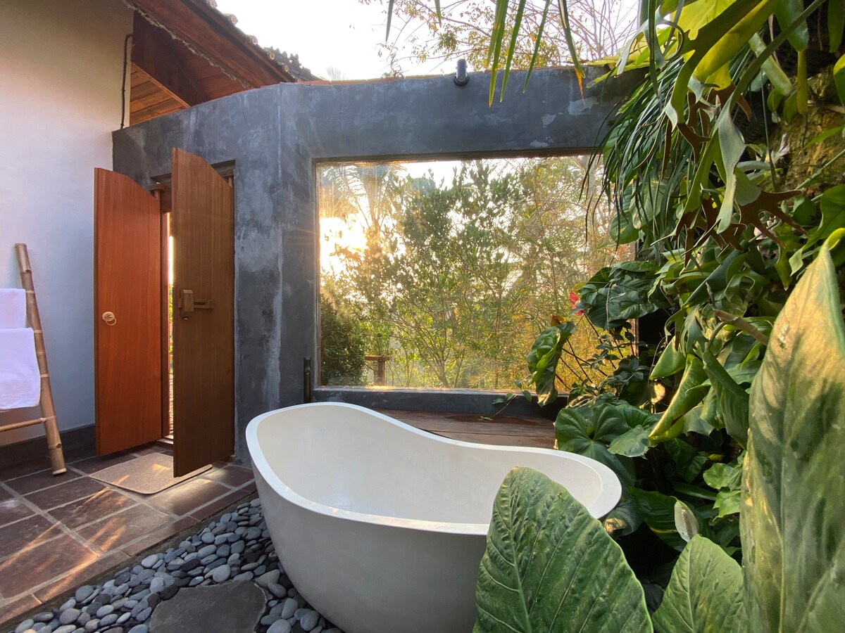 Consigue tu mejor viaje a Bali con nosotros Esta escapada única y tranquila hará que tu experiencia sea inolvidable. Hemos diseñado esta casa única para los amantes de la naturaleza. Te sentirás como si te estuvieras quedando en la naturaleza. Lo más sorprendente es que puedes sacar tu cama al balcón, donde podrás disfrutar de la puesta de sol y la selva más hermosas. También tienes un increíble baño de gusanos grande al lado de tu cama (baño de flores con cargo adicional). También tienes columpio y hamaca. También tienes una piscina privada de diseño natural.