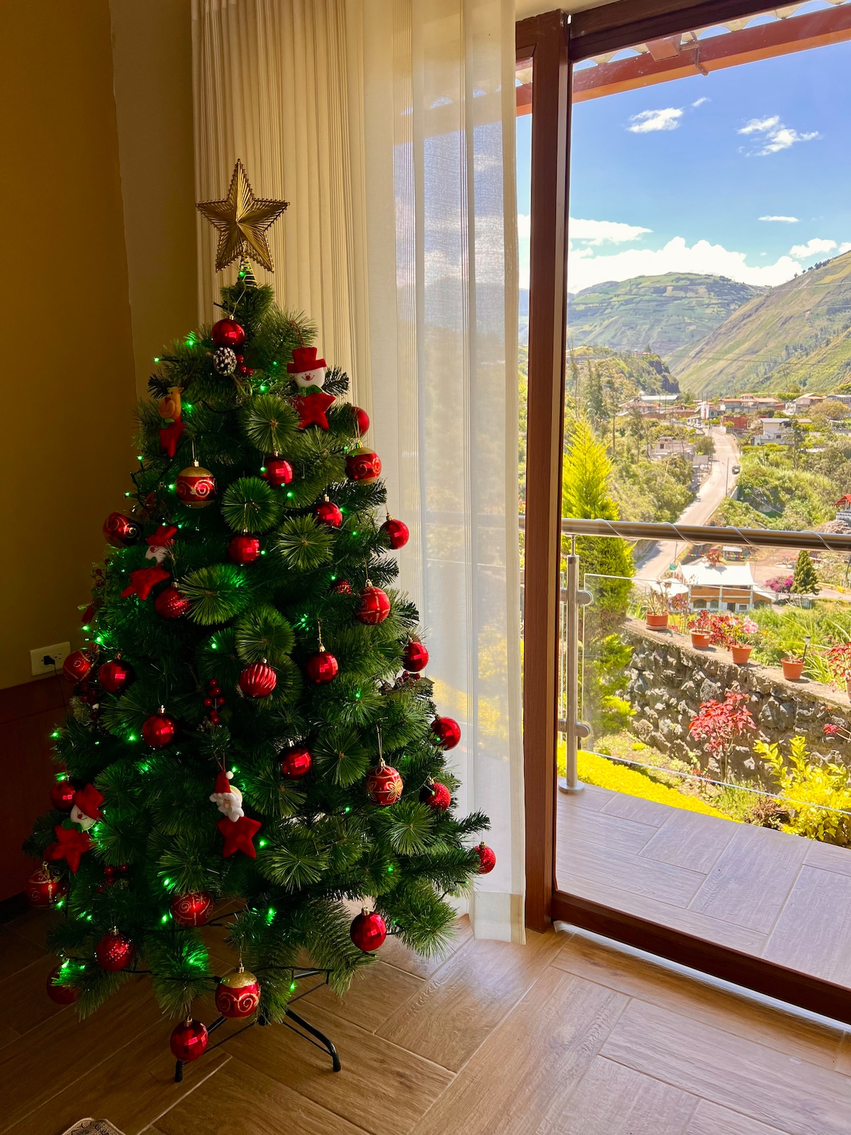 Es una casa cabaña, ubicada a 7 minutos del centro de Baños ,lleno de áreas verdes y jardines ,orquídeas y diversidad de aves , rodeada de montañas y una vista impresionante a la cuenca del rio Pastaza , única para el descanso y el relax familiar. Adicional para su conocimiento necesitan subir 38 escalones de cemento y piedra rústica , al final tendrán la recompensa de la magnífica vista al río Pastaza desde lo alto y su recién inaugurada hidropiscina de agua temperada.