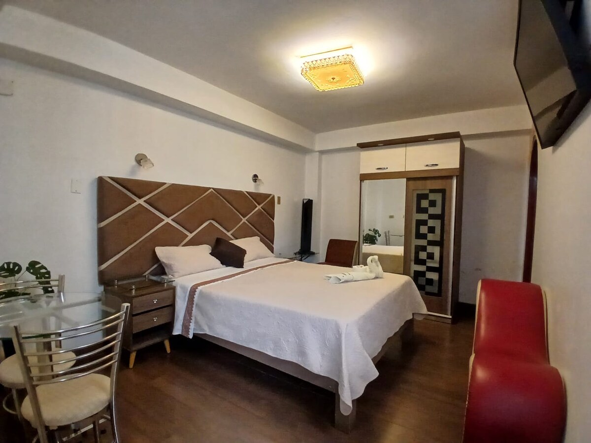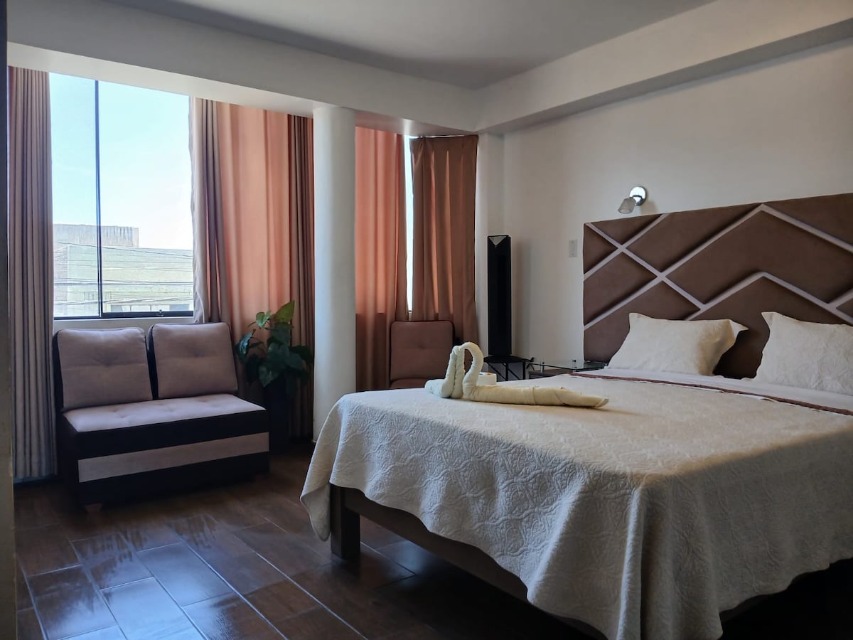 Habitación matrimonial con vista panoramica . cuenta con baño privado, tv cable, wifi, agua caliente. Estamos ubicados cerca de la plaza de armas y el Mercado municipal en mismo churin.