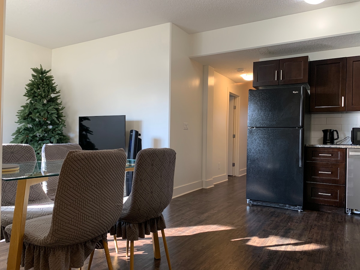 Suite moderna y acogedora de 1 dormitorio en el sótano con una oficina dedicada en un barrio tranquilo de Edmonton. Esta suite incluye un cómodo dormitorio tamaño queen y una segunda habitación configurada como oficina/espacio de trabajo dedicado. Disfruta de wifi rápido, entrada privada, TV inteligente, cocina americana y baño completo. Ideal para viajeros de negocios, parejas y familias pequeñas. Ubicado a pocos minutos del centro comercial West Edmonton, restaurantes, transporte público y carreteras principales para facilitar el acceso a la ciudad.