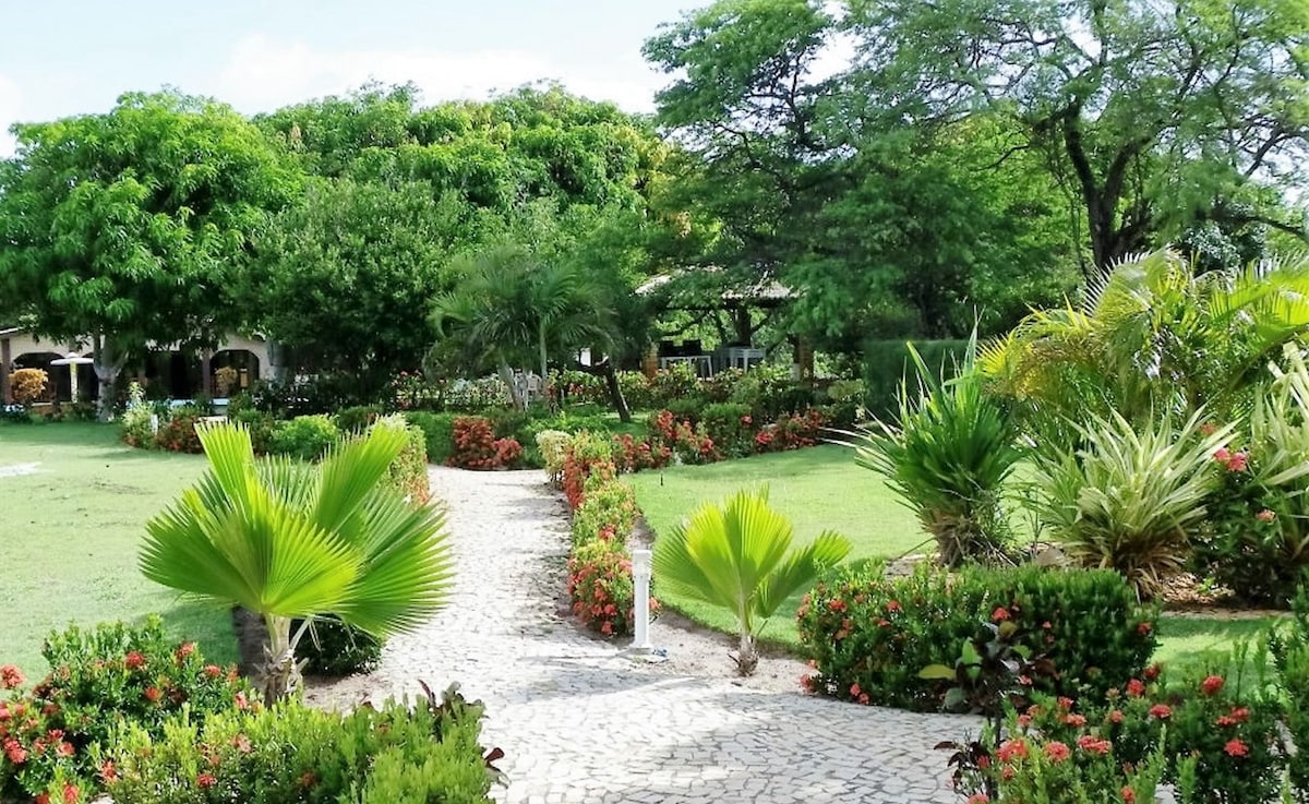 Come and enjoy an unforgettable vacation in our oasis just 300 m from the beach and near the famous Beberibe Cliffs in Ceará, Brazil. Spacious, recently renovated house with 7 bedrooms (6 are suites), all with air conditioning, double beds, and hooks for hammocks. 700 m² of built area, swimming pool, barbecue area, living and dining rooms, and fully equipped kitchen. Have fun in comfort, but please note: loud music, parties, and live bands are not allowed as this is a residential neighborhood.