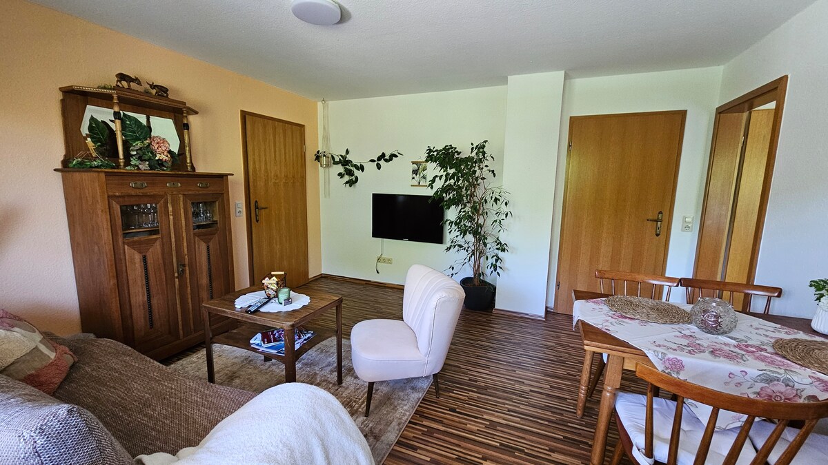 Liebe potenzielle Gäste: Ob auf der Durchreise, für eine kleine Auszeit oder aber für länger - unsere großzügige, bequeme Wohnung Elli ist schnell erreichbar und ein guter Ort, um abends zu entspannen - z.B. auf dem Balkon mit Weitblick. Im Ort gibt es ein schönes Freibad und gute Gastronomie - drumherum viel Wald. Unser Café hat wochentags ab 6 bzw. am Wochenende ab 7 Uhr Frühstück.